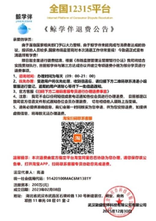 2025年12月27日,十甫寸(化名)收到了一条短信,短信内容为一张图片,抬头“全国12315平台”,标题《鲸学伴退费公告》,公告称“面临国家相关部门大力整顿,由于鲸学伴未能完成与消费者达成的协议,今致函正式宣布清退所有学费”。从12月27日至今年1月4日,她陆续收到了6次“退费公告”,于是她有些相信了。