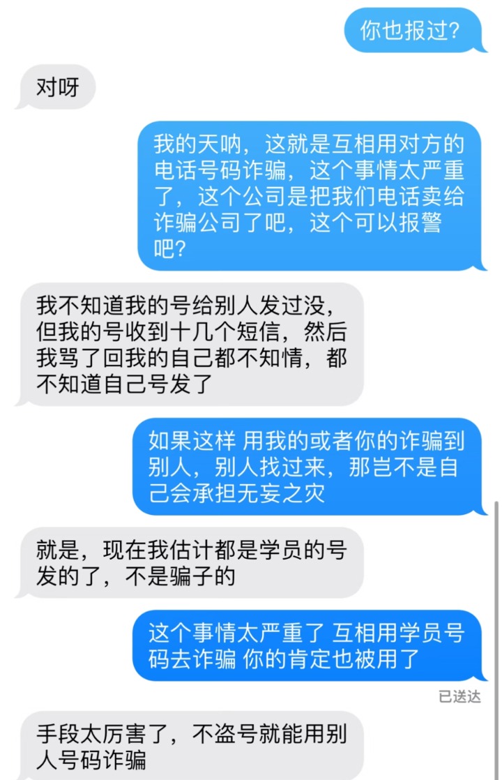 “我不知道他们怎么获取到我的信息”,多名收到退费相关信息的消费者向记者反映,添加了所谓“客服”后,报出的信息与自己在培训机构报名的信息丝毫不差,有人因此放松了警惕走入骗局。也有人询问报名机构,得到的回复却是“机构也是受害者”,而个人信息如何泄露不得而知。还有舞蹈机构的学员发现,诈骗分子利用学员的手机号互发iMessage信息,如Z女士连续收到数条《JS舞蹈培训退费公告》,其中夹杂着一条谩骂,当她询问对方时才发现,自己的账号竟被用于发送诈骗信息。
