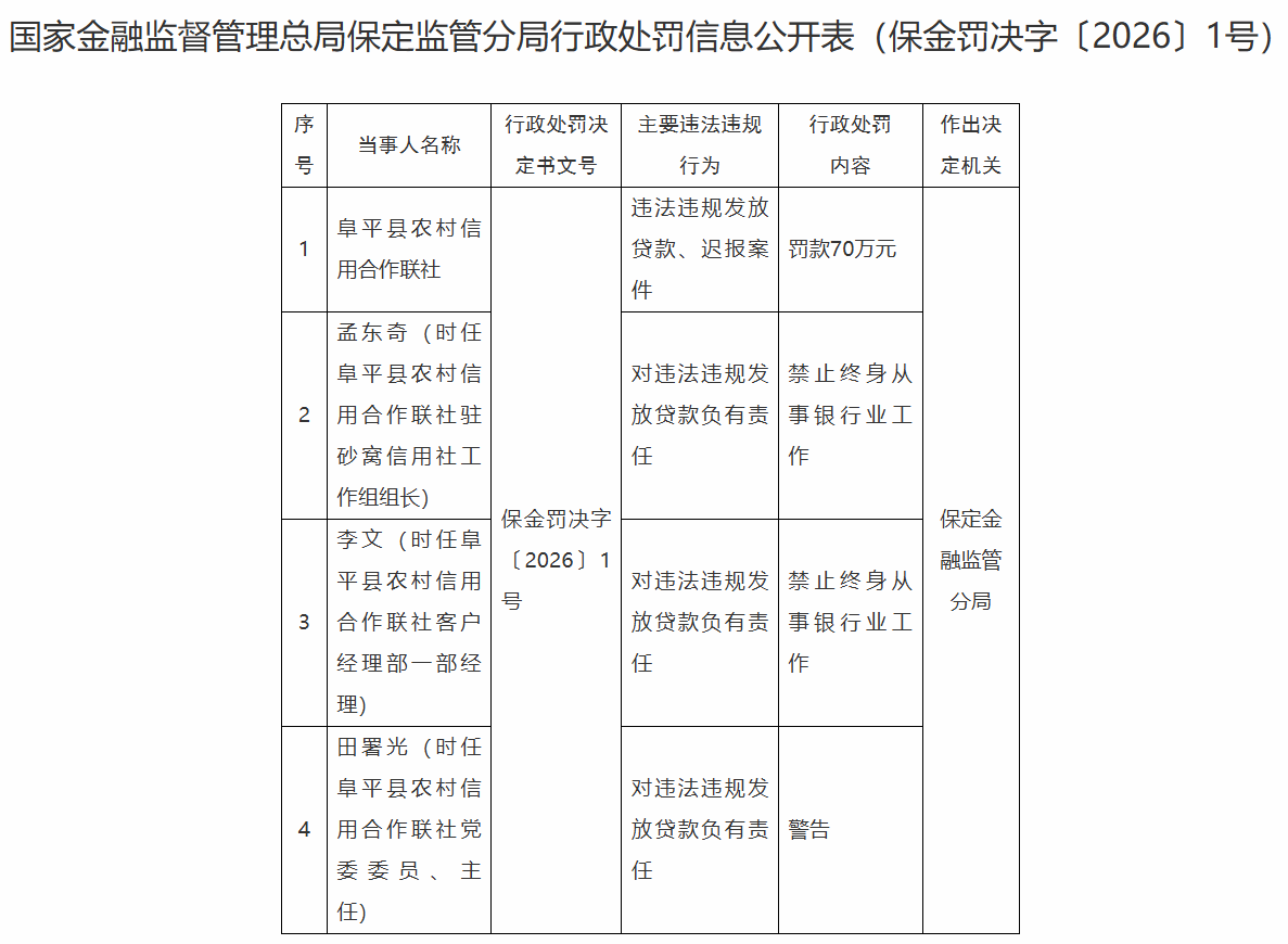 保定金融监管分局对时任阜平县农村信用合作联社驻砂窝信用社工作组组长孟东奇、时任阜平县农村信用合作联社客户经理部一部经理李文禁止终身从事银行业工作;对时任阜平县农村信用合作联社党委委员、主任田署光警告。