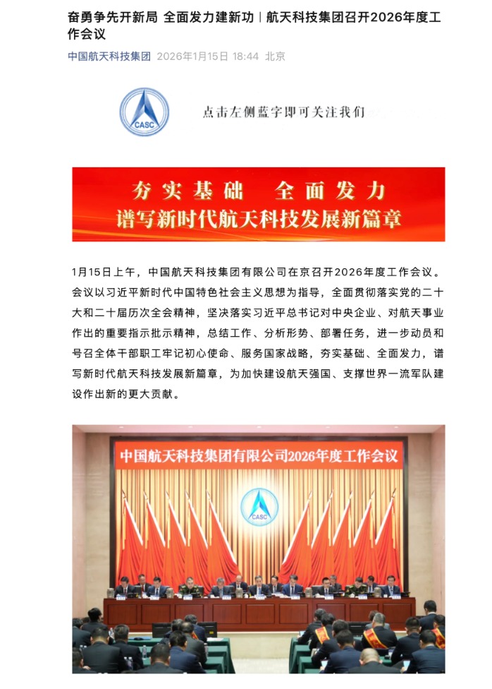 1月15日,中国航天科技集团官微发布消息称,当日上午,公司在京召开2026年度工作会议。