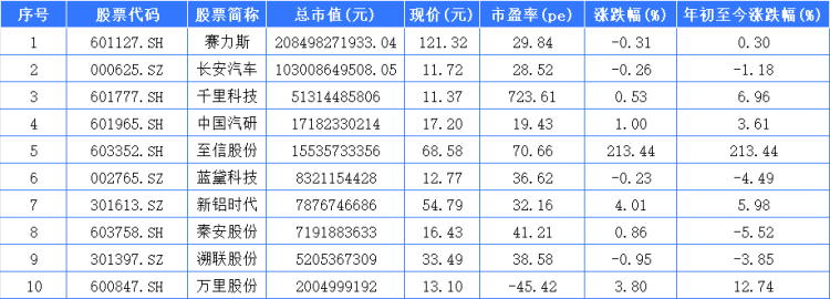 其中整车制造企业有3家,分别为1997年上市的长安汽车(A+B股),2010年上市的千里科技,2016年上市的赛力斯(原小康股份)(A+H股)。