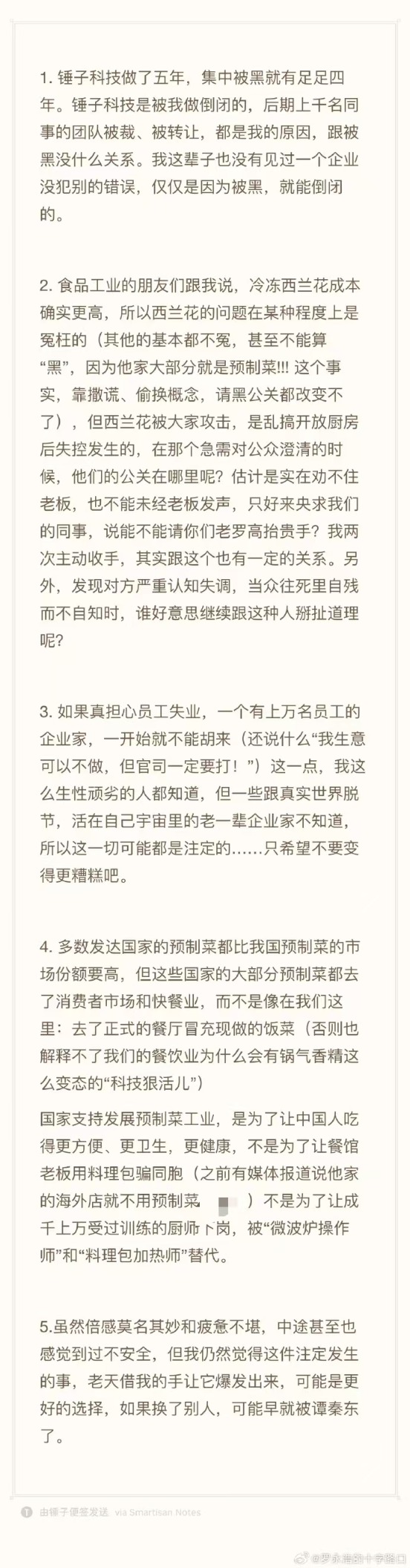 1月16日,罗永浩公开表示,锤子科技倒闭是他的原因,没见过一家企业仅仅因为被黑就能倒闭;如果担心员工失业,作为企业家,一开始就不应胡来;多数发达国家预制菜比我国市场份额高,但主要流向消费者市场与快餐业,而非正式餐厅。