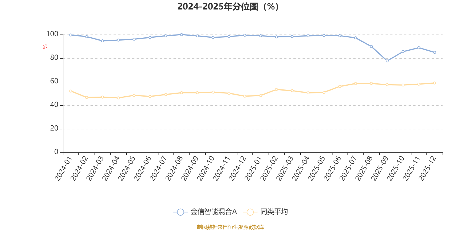 通过所选区间该基金净值增长率分位图,可以观察该基金与同类基金业绩比较情况。图为坐标原点到区间内某时点的净值增长率在同类基金中的分位数。