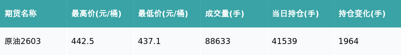 21智讯1月16日电,南财金融终端盘后期货数据显示,上期能源的原油主力合约收跌3.01%,收盘报438.8元/桶,日内资金流入9956.13万元。其他相关指标见下表: