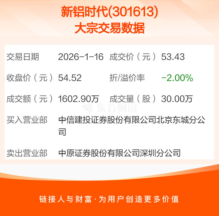大宗交易:新铝时代成交1602.90万元,折价2.00%(1-16)
