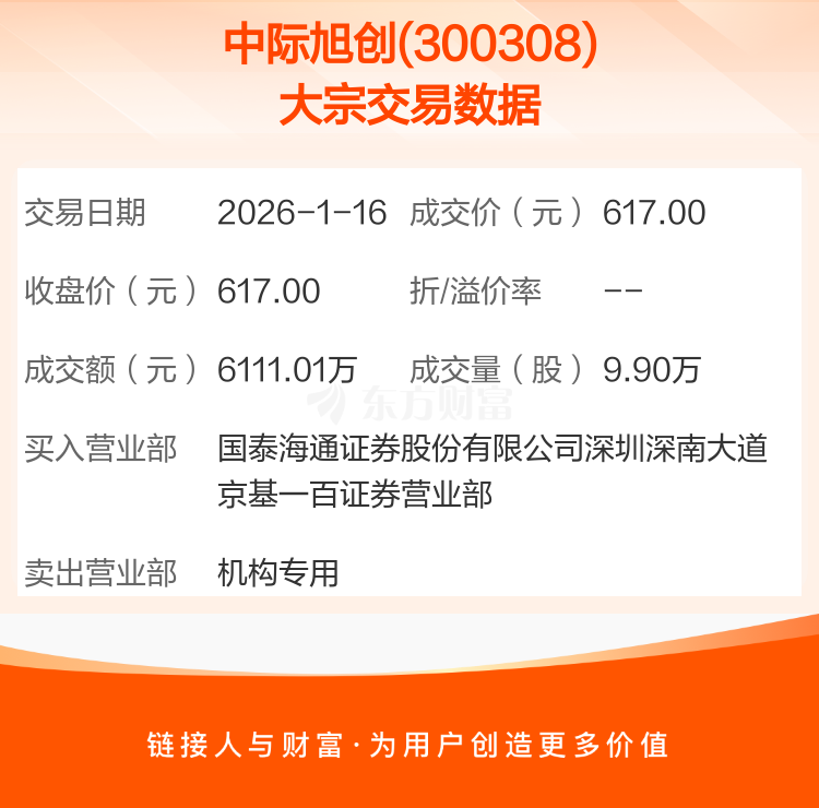 2026年1月16日,中际旭创发生1笔大宗交易,共成交9.90万股,成交金额6111.01万元。