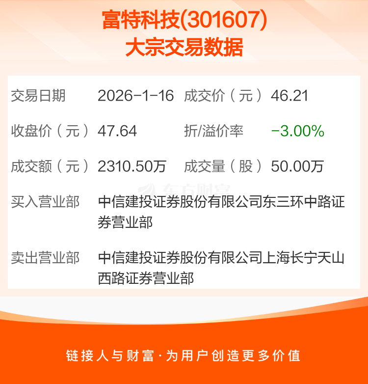 2026年1月16日,富特科技发生1笔大宗交易,共成交50.00万股,成交金额2310.50万元,占其流通市值比例为0.43%。