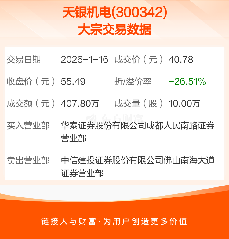 2026年1月16日,天银机电发生1笔大宗交易,共成交10.00万股,成交金额407.80万元,占其流通市值比例为0.02%。