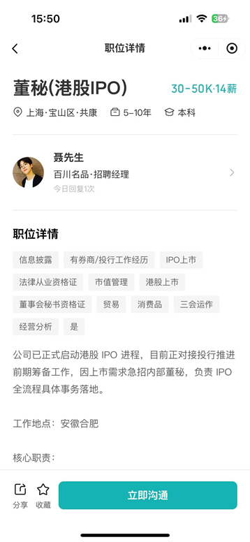 据其在BOSS直聘披露的招聘信息,百川名品已正式启动港股IPO进程,目前正对接投行推进上市前期筹备工作,现阶段因上市需求急招内部董秘,负责IPO全流程具体事务落地。