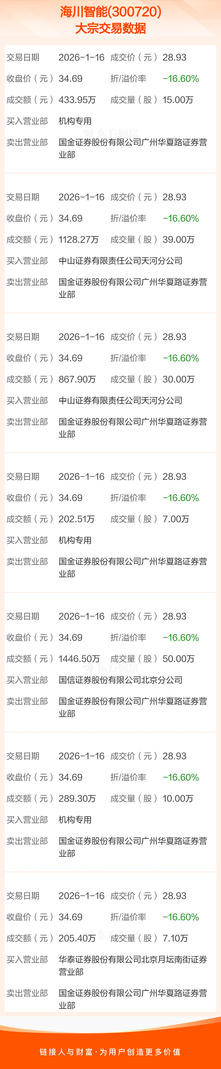 大宗交易:海川智能成交4573.83万元,折价16.60%(1-16)