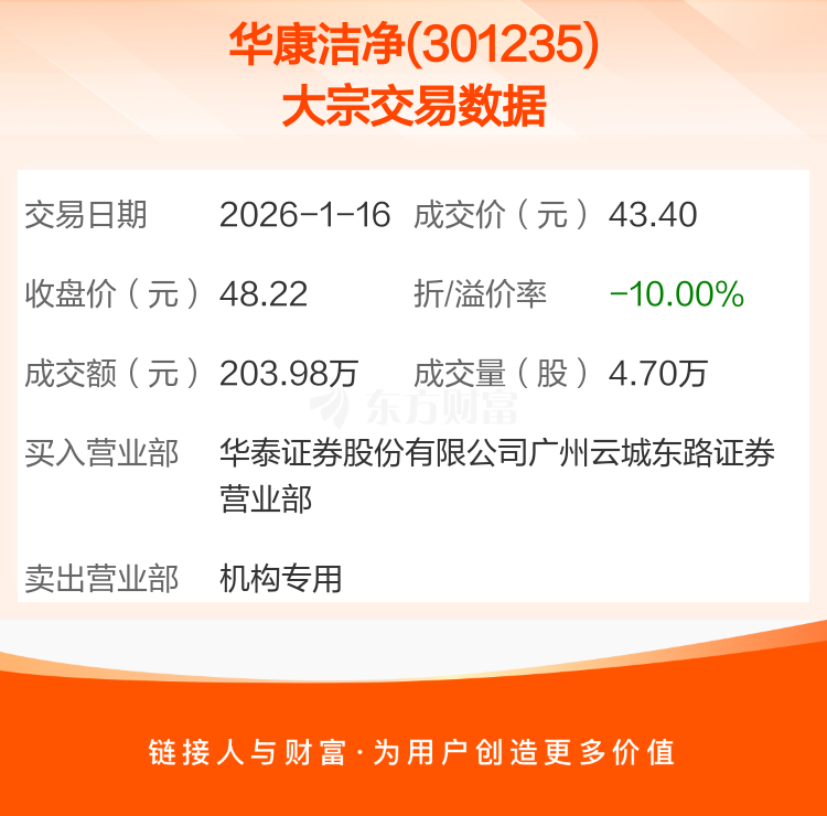 2026年1月16日,华康洁净发生1笔大宗交易,共成交4.70万股,成交金额203.98万元,占其流通市值比例为0.06%。