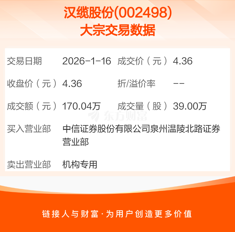 2026年1月16日,汉缆股份发生1笔大宗交易,共成交39.00万股,成交金额170.04万元,占其流通市值比例为0.01%。