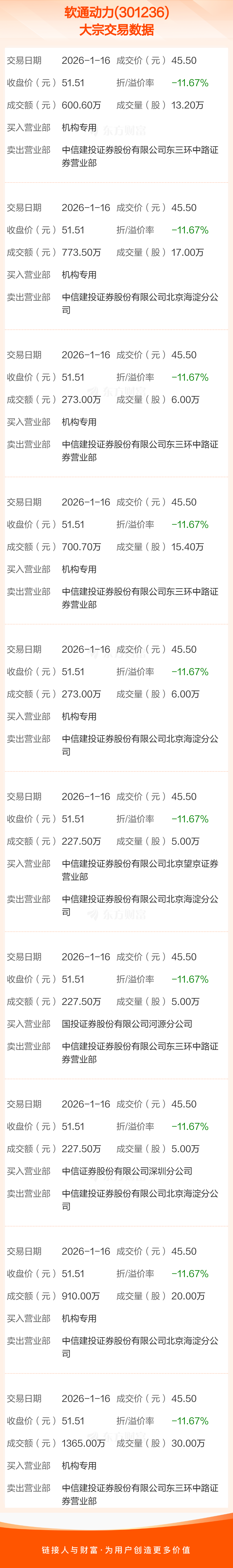 2026年1月16日,软通动力发生10笔大宗交易,共成交122.60万股,成交金额5578.30万元,占其流通市值比例为0.14%。