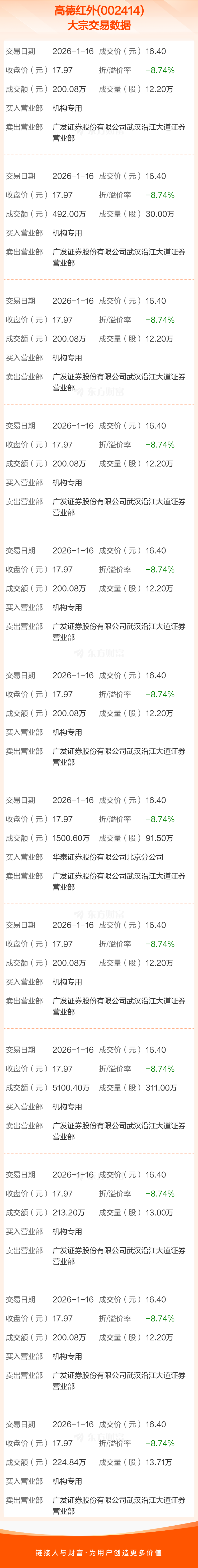 2026年1月16日,高德红外发生12笔大宗交易,共成交544.61万股,成交金额8931.60万元,占其流通市值比例为0.15%。