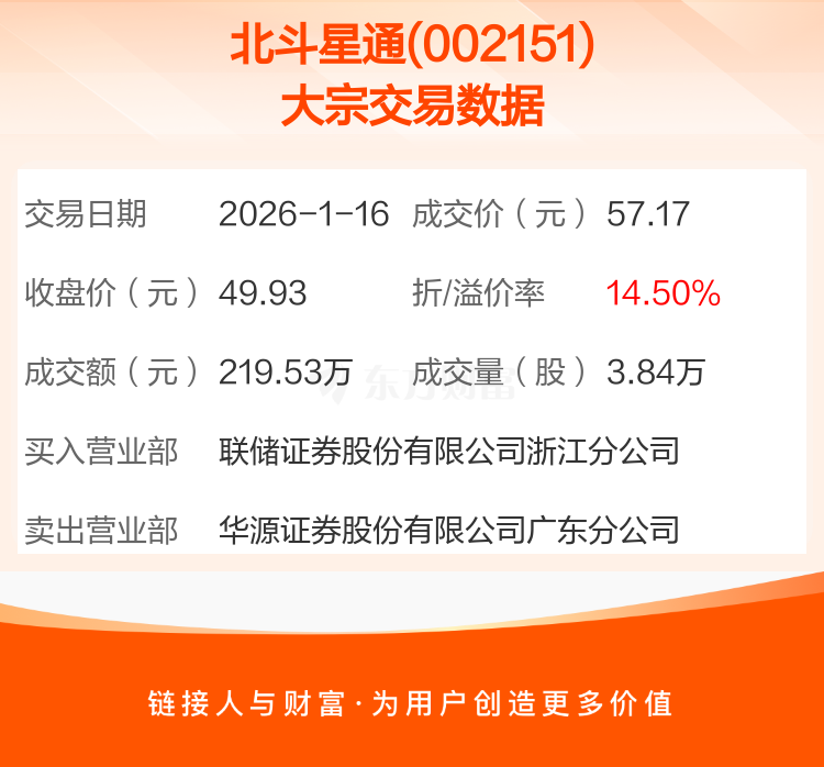 大宗交易:北斗星通成交219.53万元,溢价14.50%(1-16)