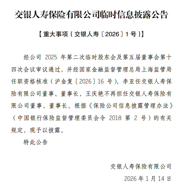 1月14日,交银人寿保险有限公司(下称“交银人寿”)发布公告称,经公司2025年第二次临时股东会及董事会审议通过,并经上海金融监管局任职资格核准,李亚任交银人寿董事、董事长,王庆艳不再担任交银人寿董事、董事长。