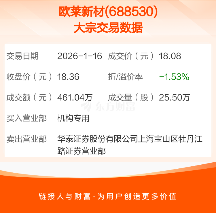 2026年1月16日,欧莱新材发生1笔大宗交易,共成交25.50万股,成交金额461.04万元,占其流通市值比例为0.37%。