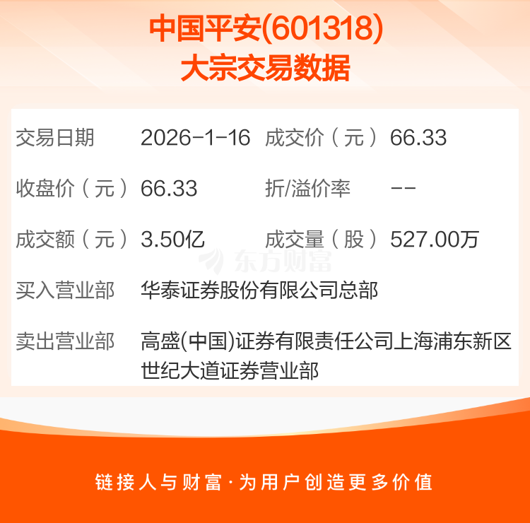 2026年1月16日,中国平安发生1笔大宗交易,共成交527.00万股,成交金额3.50亿元,占其流通市值比例为0.05%。