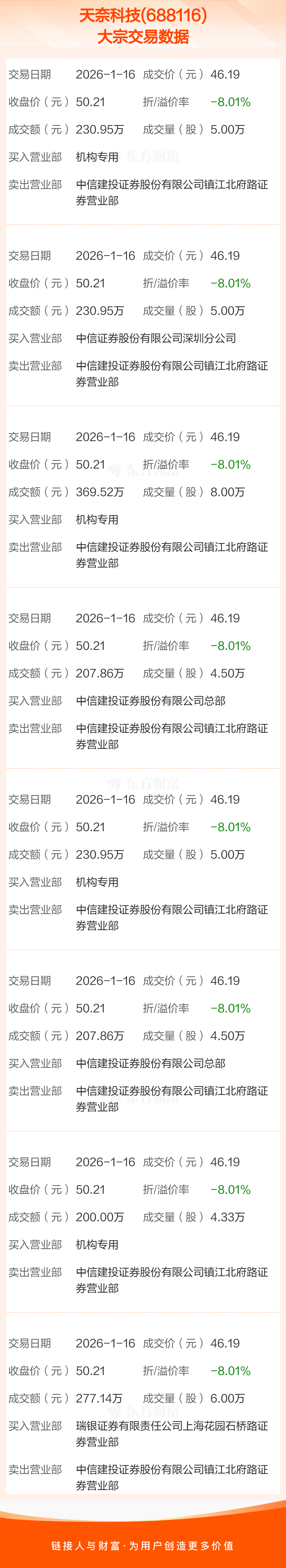 2026年1月16日,天奈科技发生8笔大宗交易,共成交42.33万股,成交金额1955.23万元,占其流通市值比例为0.11%。