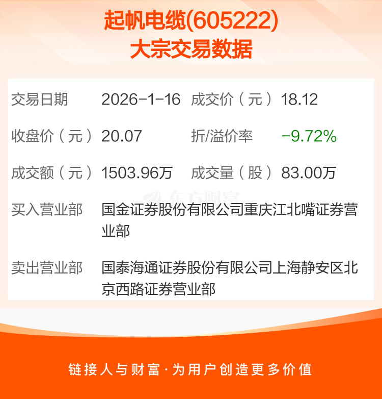 2026年1月16日,起帆电缆发生1笔大宗交易,共成交83.00万股,成交金额1503.96万元,占其流通市值比例为0.18%。