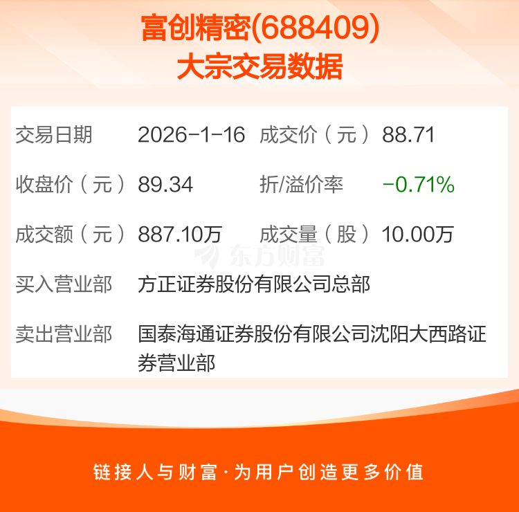 2026年1月16日,富创精密发生1笔大宗交易,共成交10.00万股,成交金额887.10万元,占其流通市值比例为0.03%。