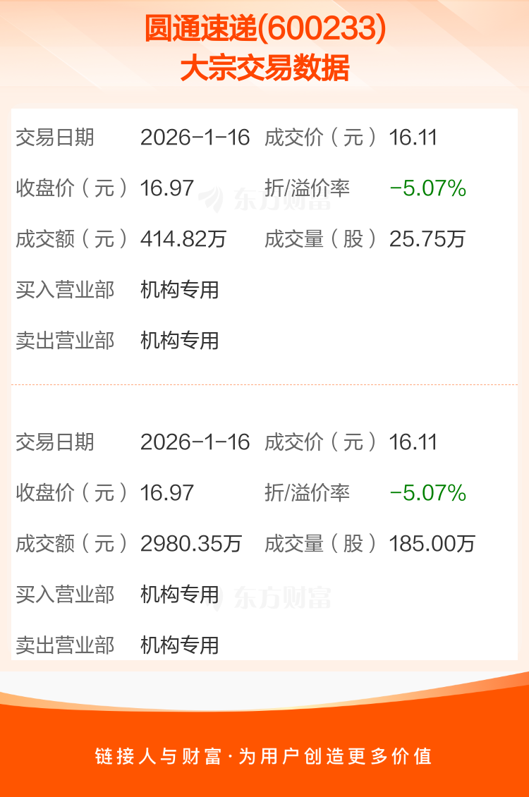 2026年1月16日,圆通速递发生2笔大宗交易,共成交210.75万股,成交金额3395.17万元,占其流通市值比例为0.06%。