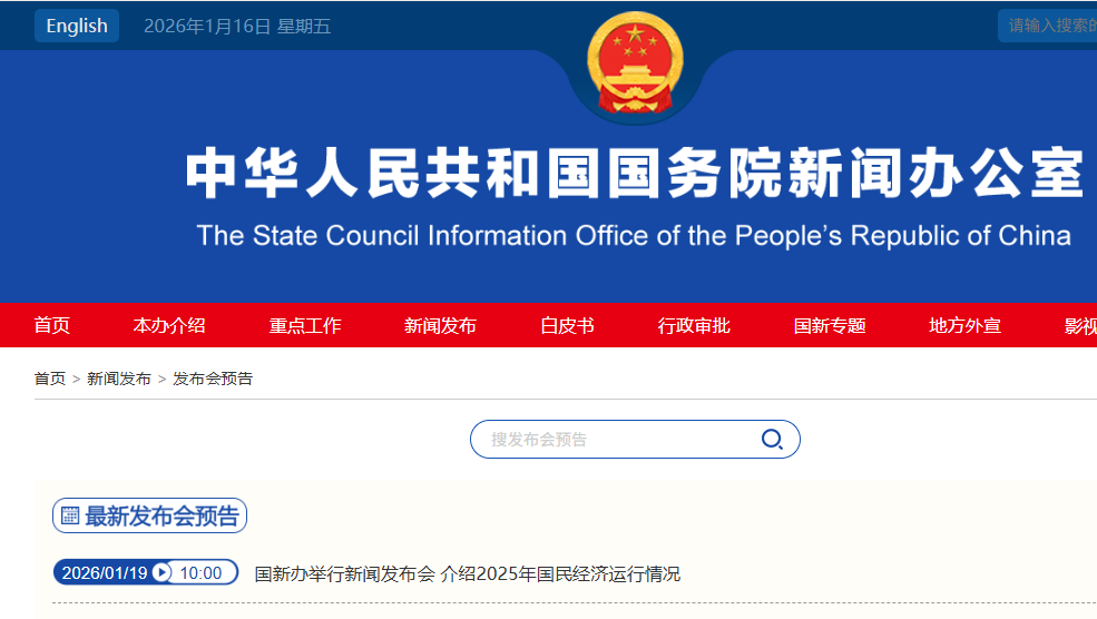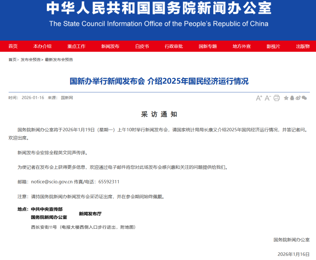 1月16日,据国新办官网,国务院新闻办公室将于2026年1月19日(星期一)上午10时举行新闻发布会,请国家统计局局长康义介绍2025年国民经济运行情况,并答记者问。