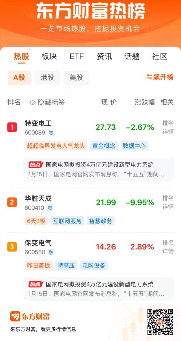 1月16日,两市高开低走,三大指数均小幅收跌。东方财富热榜前三的股票中,特变电工位列第1,华胜天成位列第2,保变电气位列第3。