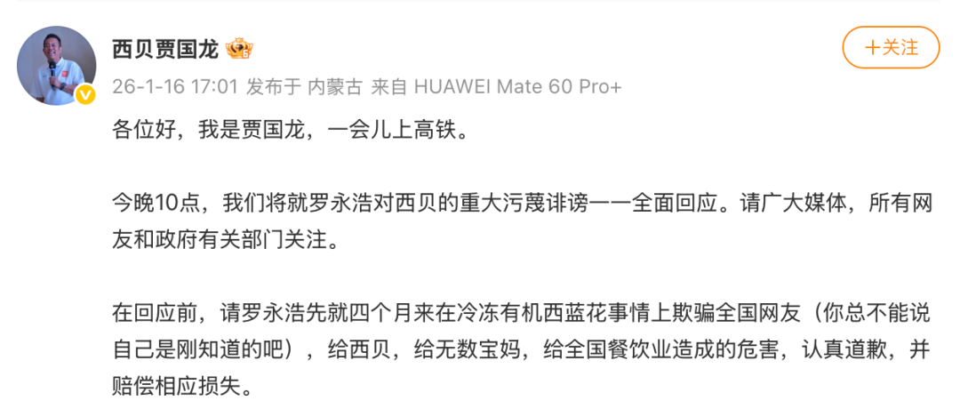 【导读】西贝和罗永浩的“口水战”再度升级!西贝贾国龙发声:今晚10点,将就罗永浩对西贝的重大污蔑诽谤一一全面回应,要求认真道歉并赔偿损失