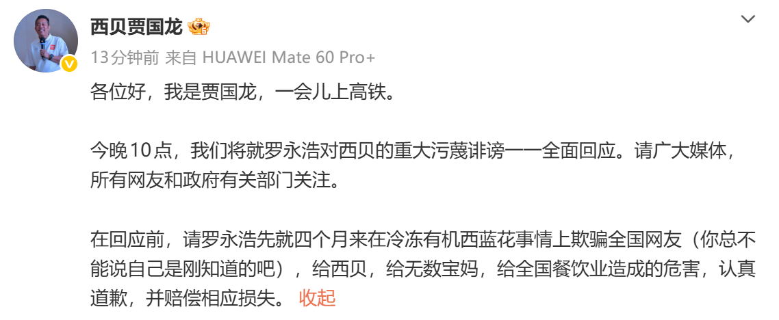 贾国龙最新发声:今晚10点,将就罗永浩对西贝的重大污蔑诽谤一一全面回应