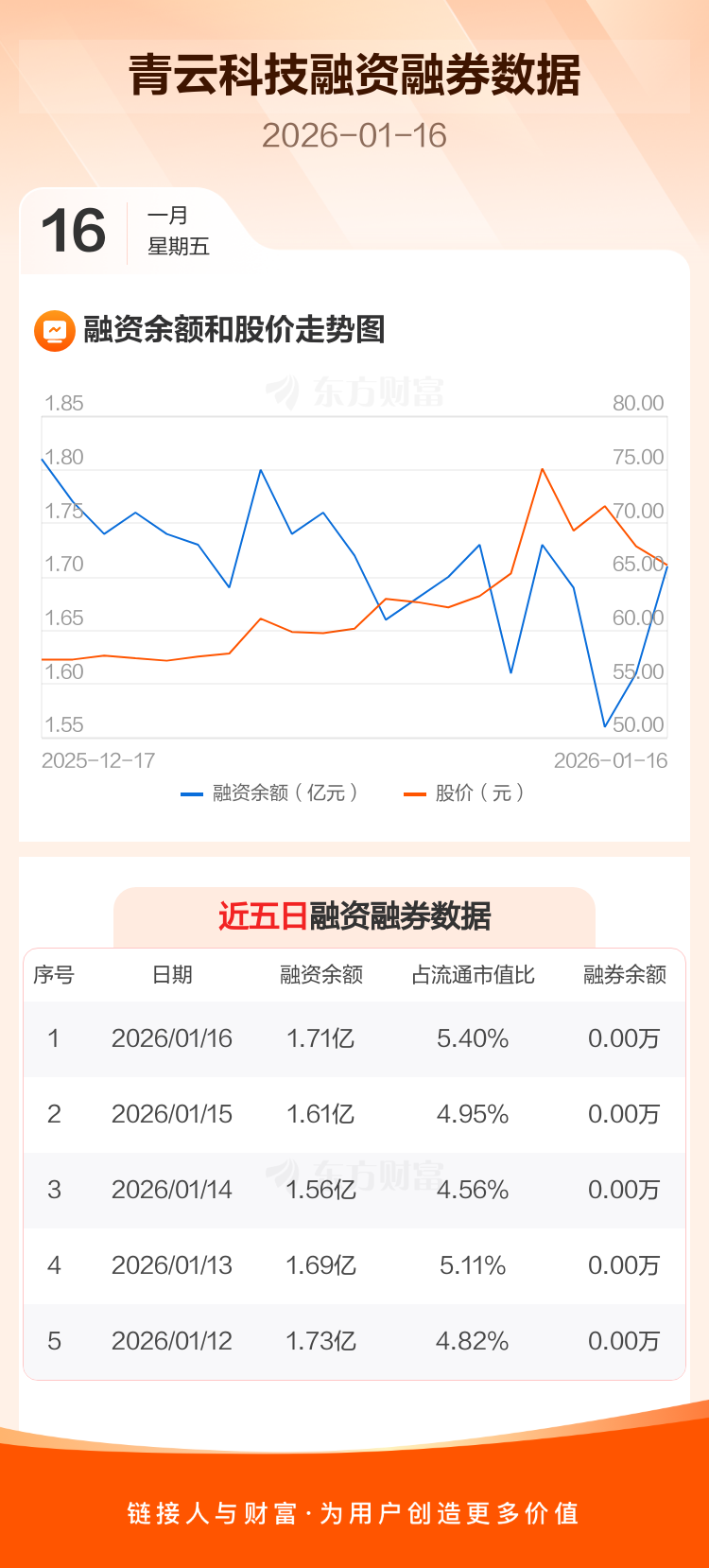 交易所最新数据显示,青云科技于2026年1月16日获融资买入2545.82万元,融资偿还1540.29万元,当日融资净买入1005.52万元。目前,该股融资余额1.71亿,占流通市值比例为5.40%。