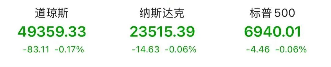 美东时间周五,美股三大指数全天窄幅震荡,收盘几乎持平。截至收盘,道指跌0.17%,报49359.33点;纳指跌0.06%,报23515.39点;标普500指数跌0.06%,报6940.01点。