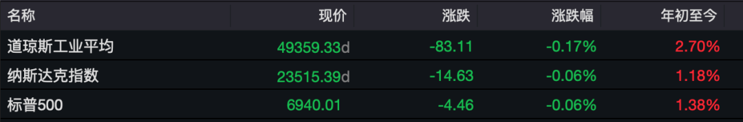 当地时间1月16日,欧美股市集体收跌。美国三大股指小幅下跌,截至收盘,道琼斯工业指数跌0.17%报49359.33点,标普500指数跌0.06%报6940.01点,纳斯达克指数跌0.06%报23515.39点。本周,道琼斯工业指数跌0.29%,标普500指数跌0.38%,纳斯达克指数跌0.66%。