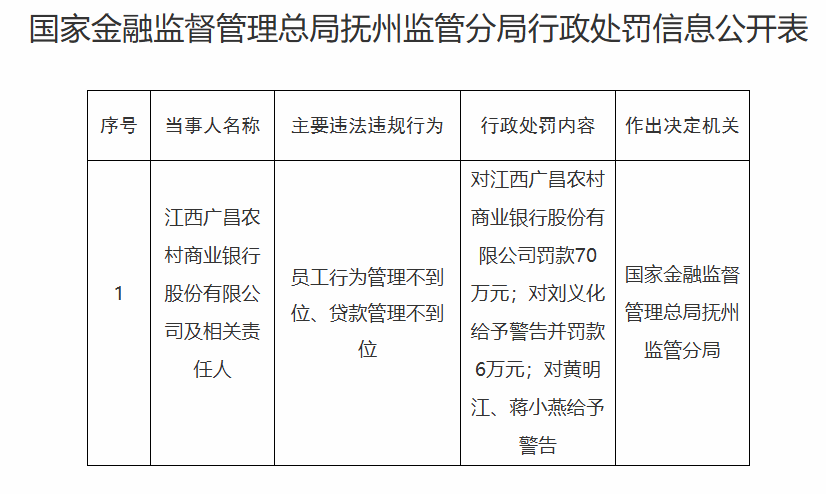 1月17日消息,国家金融监督管理总局抚州监管分局日前披露的行政处罚信息公开表显示,因员工行为管理不到位、贷款管理不到位,江西广昌农村商业银行股份有限公司被罚70万元。