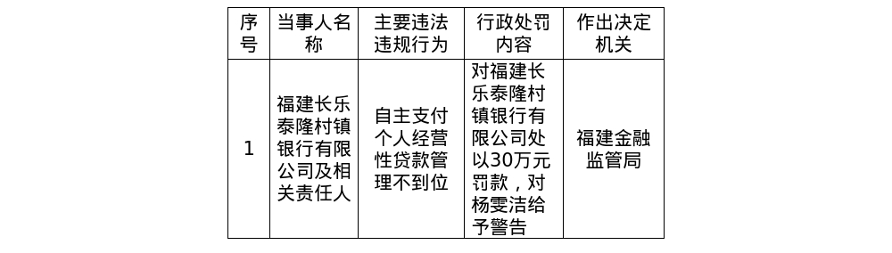 福建长乐泰隆村镇银行被罚30万,涉自主支付个人经营性贷款管理不到位