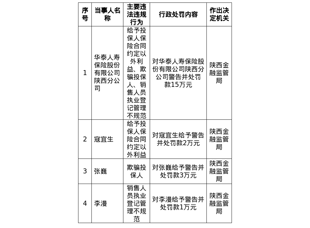 罚单显示,华泰人寿保险股份有限公司陕西分公司的主要违法违规事实(案由)为:给予投保人保险合同约定以外利益;欺骗投保人;销售人员执业登记管理不规范。