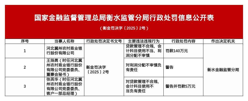 针对上述违法违规行为,国家金融监督管理总局衡水监管分局对其罚款140万元;对王扬勇(时任河北冀州农村商业银行股份有限公司党委委员、董事会秘书)警告;对张英华(时任河北冀州农村商业银行股份有限公司党委委员、客户一部总经理)警告并处罚款5万元。