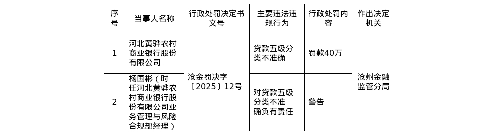 河北黄骅农商行被罚40万,涉贷款五级分类不准确