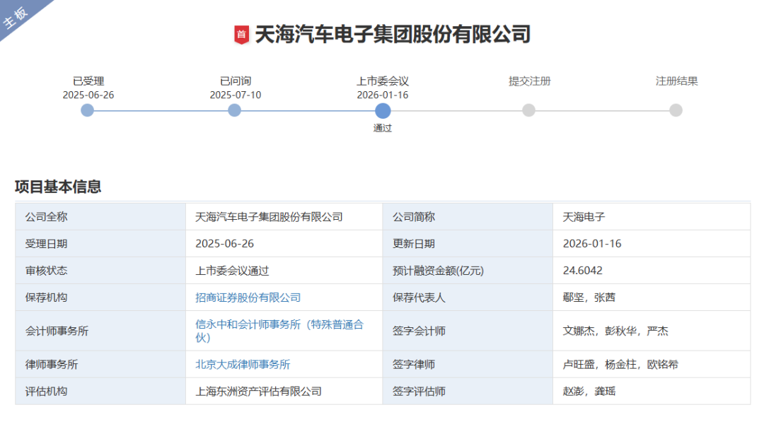 1月16日,天海汽车电子集团股份有限公司(以下简称“天海电子”)经深圳证券交易所创业板上市委员会审议,成功过会。
