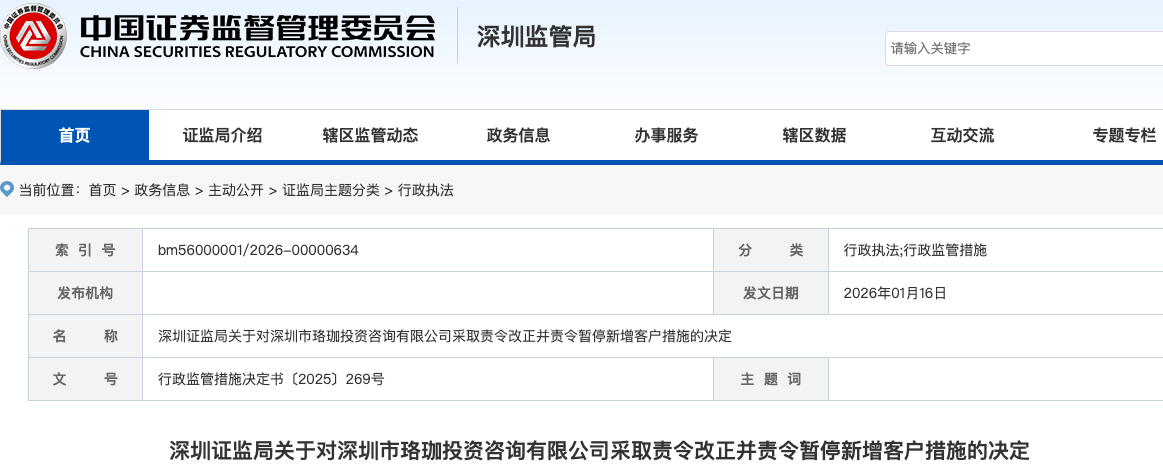 1月16日,深圳证监局公告显示,因营销宣传、投资建议发布及内控合规管理等方面存在违规问题,老牌投顾公司深圳珞珈投资被责令改正,并暂停新增客户6个月。同时,董事长陈杰被采取监管谈话的监管措施。
