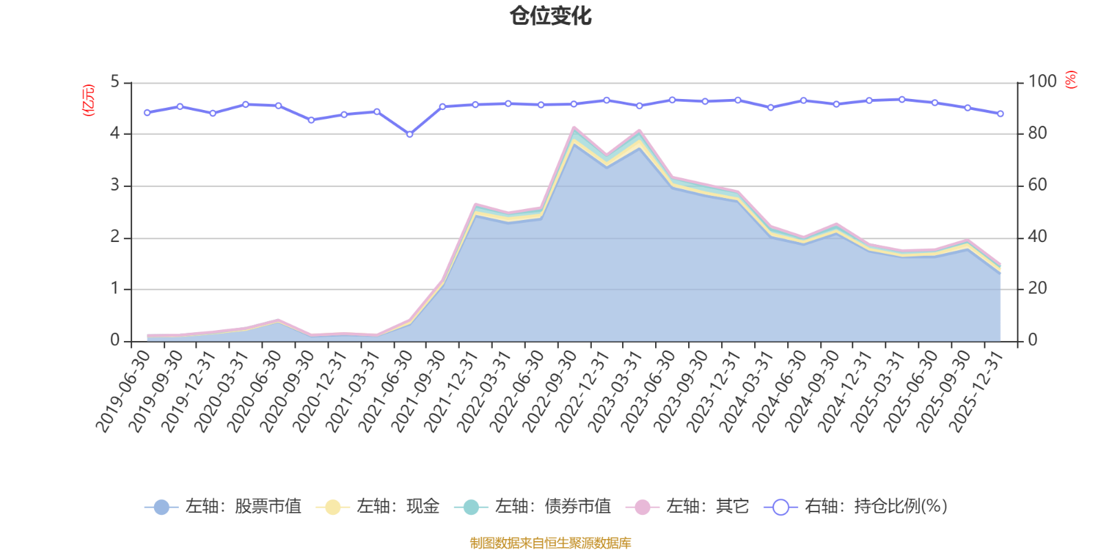 据定期报告数据统计,近三年平均股票仓位为91.84%,同类平均为72.46%。2025年一季度末基金达到93.45%的最高仓位,2021年上半年末最低,为79.99%。