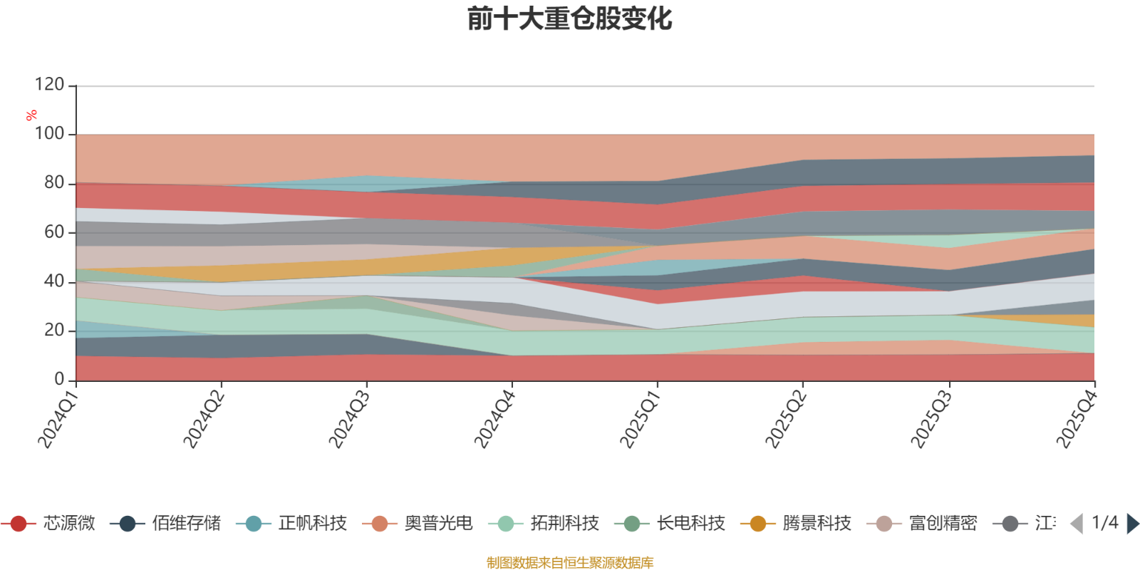 该基金持股集中度较高,近2年前十大重仓股集中度长期超过60%。截至2025年四季度末,基金十大重仓股分别是中微公司、芯源微、茂莱光学、中科飞测、拓荆科技、福晶科技、波长光电、汇成真空、英诺激光、腾景科技。