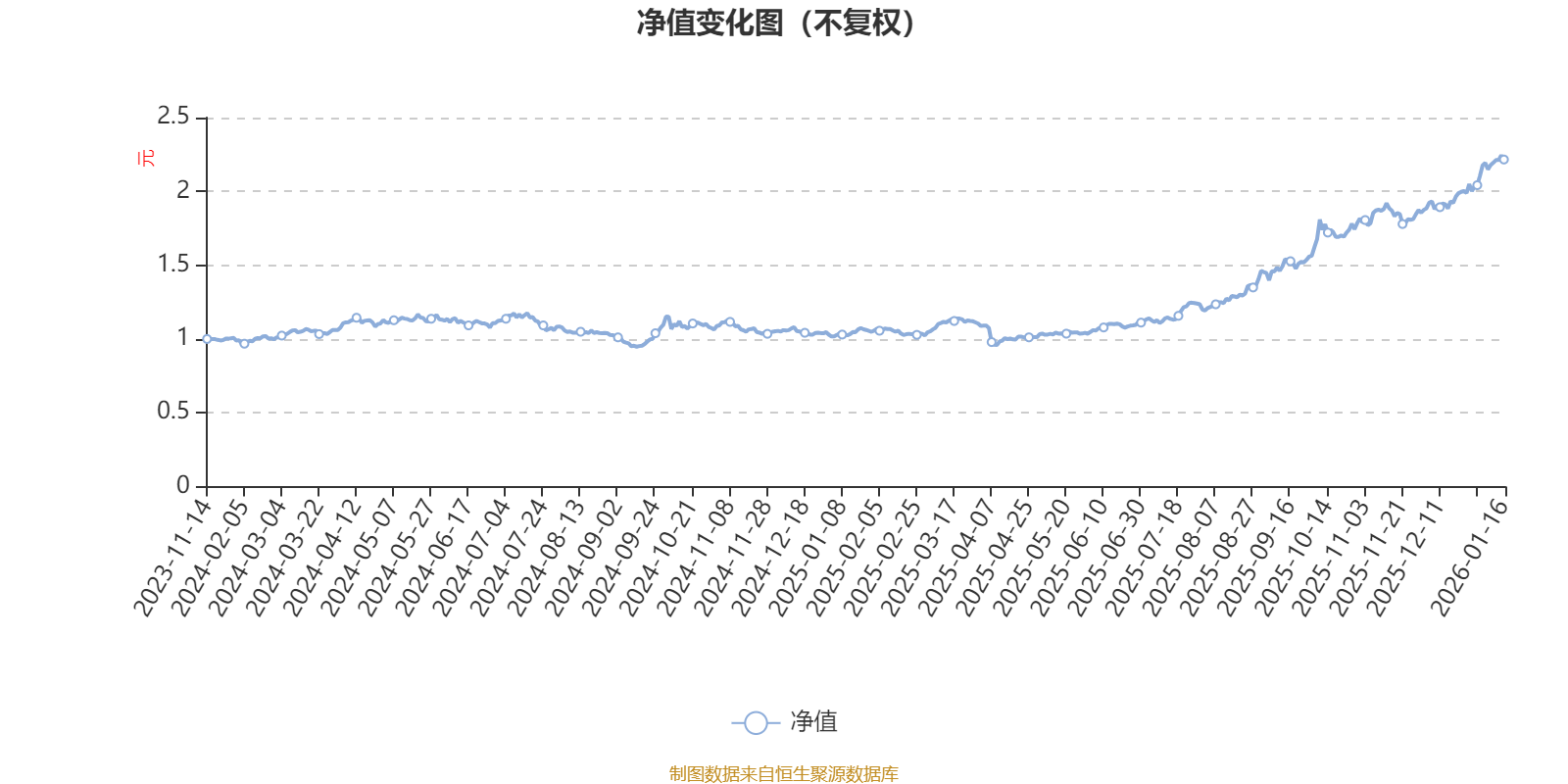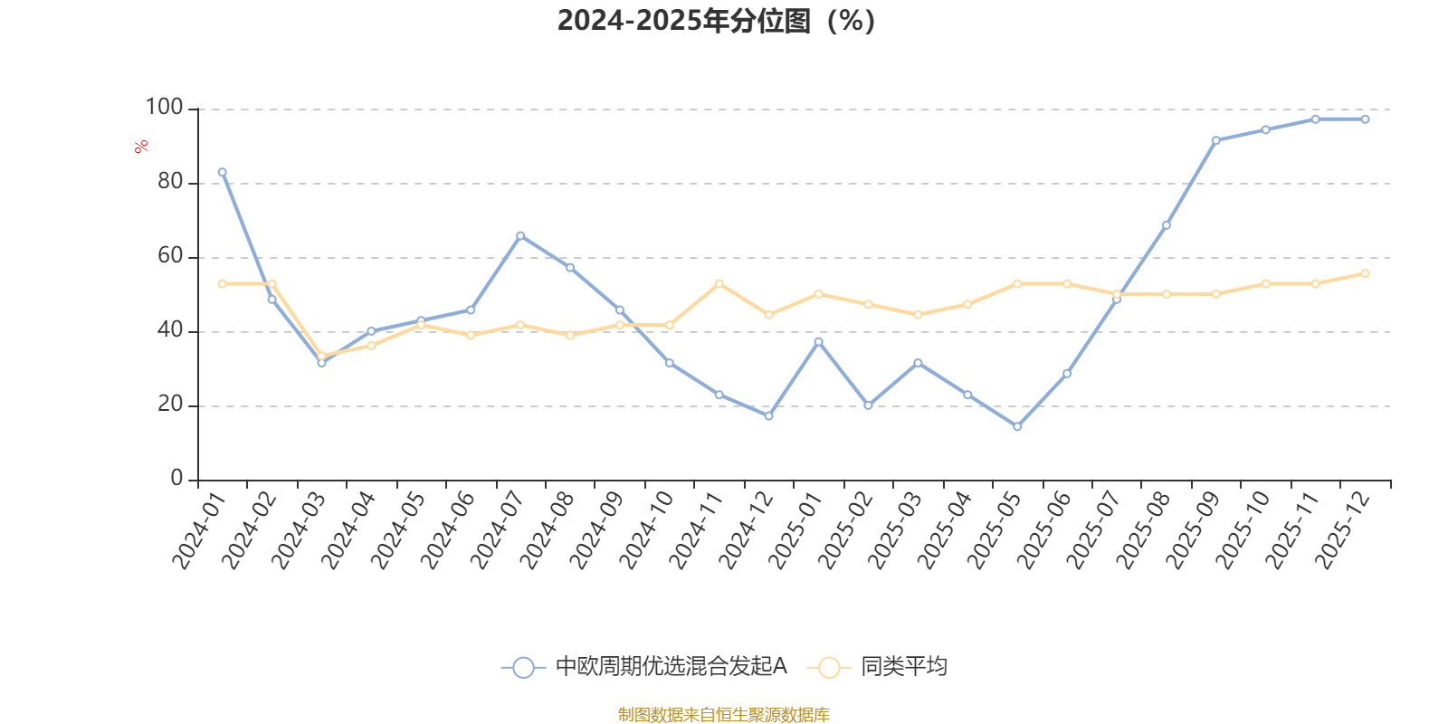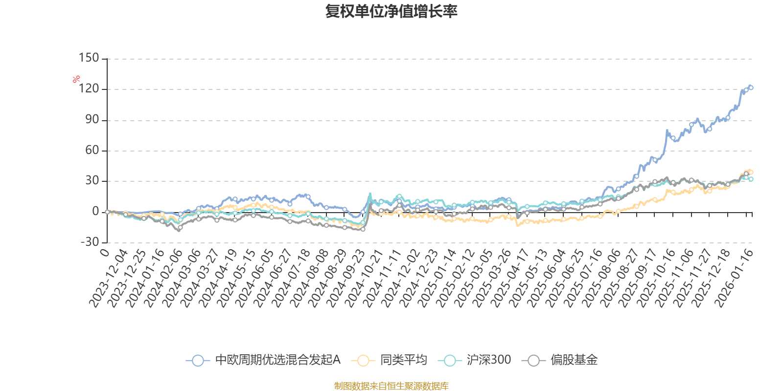 截至1月16日,中欧周期优选混合发起A近三个月复权单位净值增长率为28.53%,位于同类可比基金6/49;近半年复权单位净值增长率为95.96%,位于同类可比基金1/49;近一年复权单位净值增长率为108.03%,位于同类可比基金1/44。