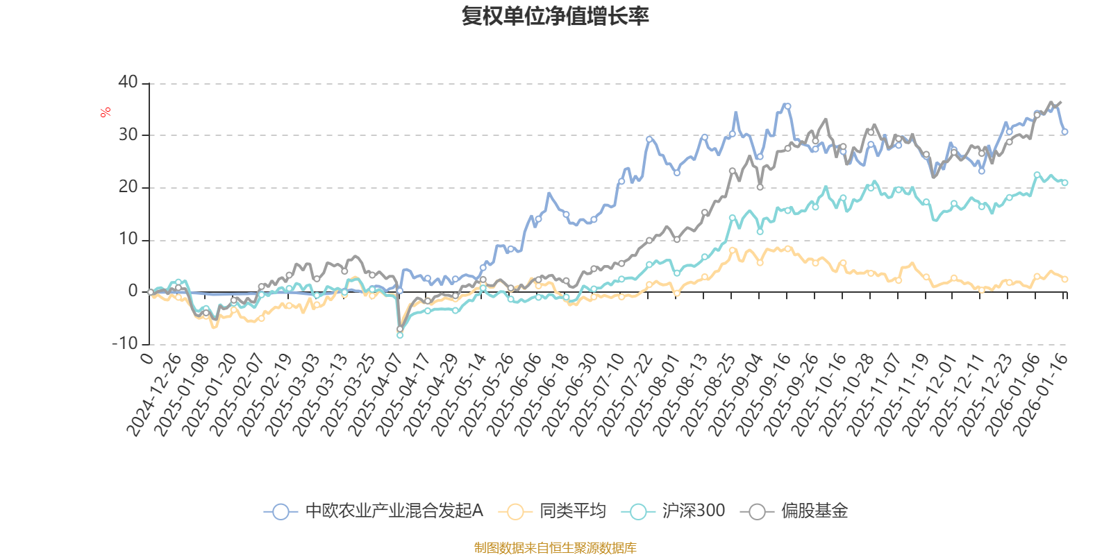 截至1月16日,中欧农业产业混合发起A近三个月复权单位净值增长率为2.99%,位于同类可比基金7/85;近半年复权单位净值增长率为6.89%,位于同类可比基金20/85;近一年复权单位净值增长率为31.29%,位于同类可比基金1/83。