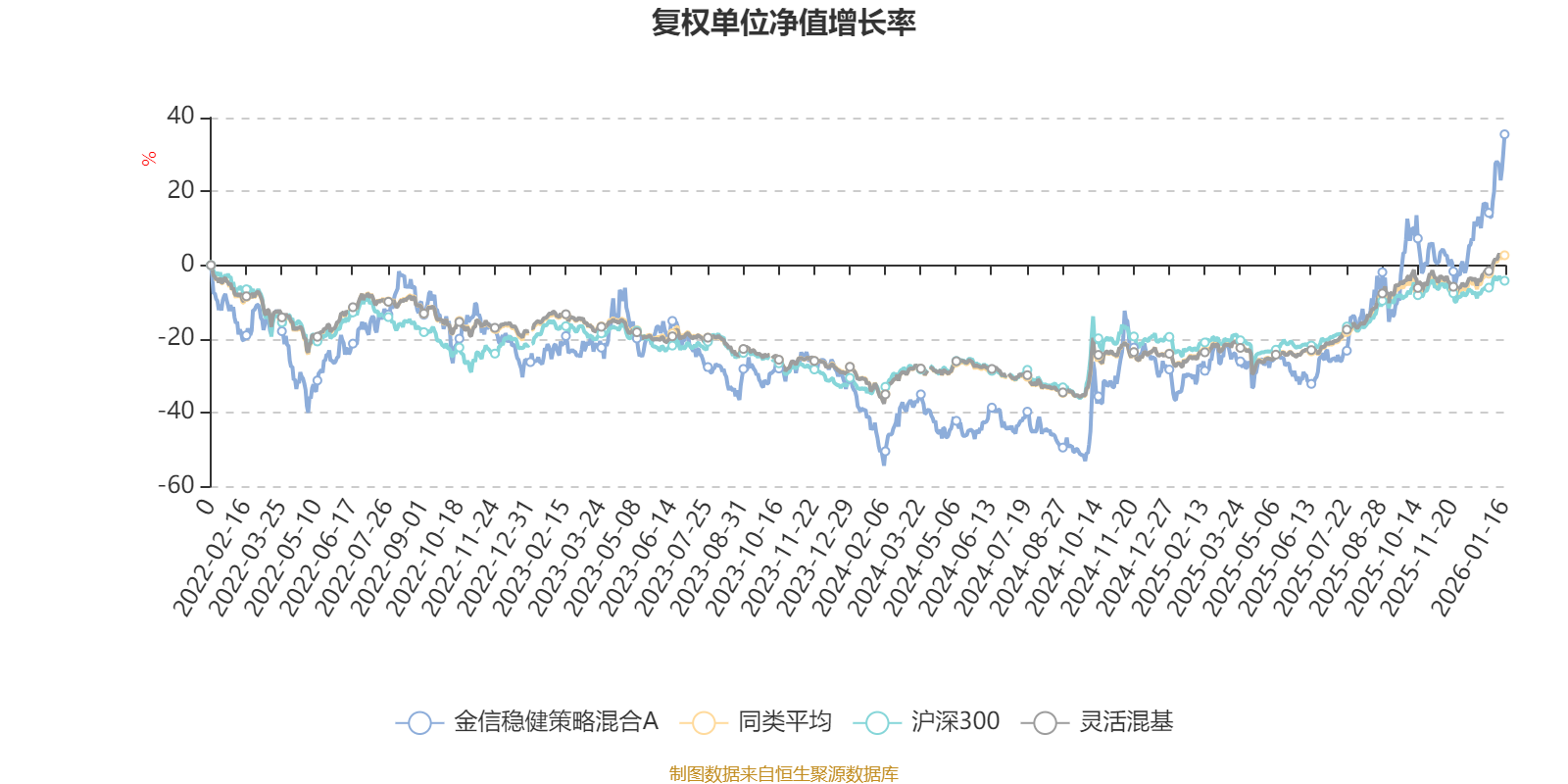 截至1月16日,金信稳健策略混合A近三个月复权单位净值增长率为33.14%,位于同类可比基金16/1286;近半年复权单位净值增长率为82.85%,位于同类可比基金15/1286;近一年复权单位净值增长率为93.67%,位于同类可比基金45/1286;近三年复权单位净值增长率为81.09%,位于同类可比基金64/1286。