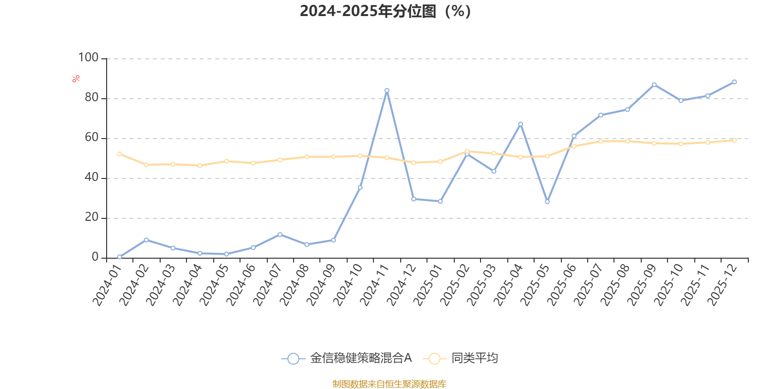 通过所选区间该基金净值增长率分位图,可以观察该基金与同类基金业绩比较情况。图为坐标原点到区间内某时点的净值增长率在同类基金中的分位数。