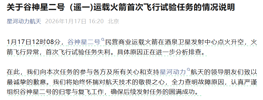 17日下午,星河动力航天发布情况说明称:“在此,我们向本次任务的参与各方及所有关心和支持星河动力航天的领导朋友们致以最诚挚的歉意。我们将始终怀揣对航天技术的敬畏之心,全力查明故障原因,认真严谨组织谷神星二号的归零与复飞工作,确保后续发射任务的圆满成功。”