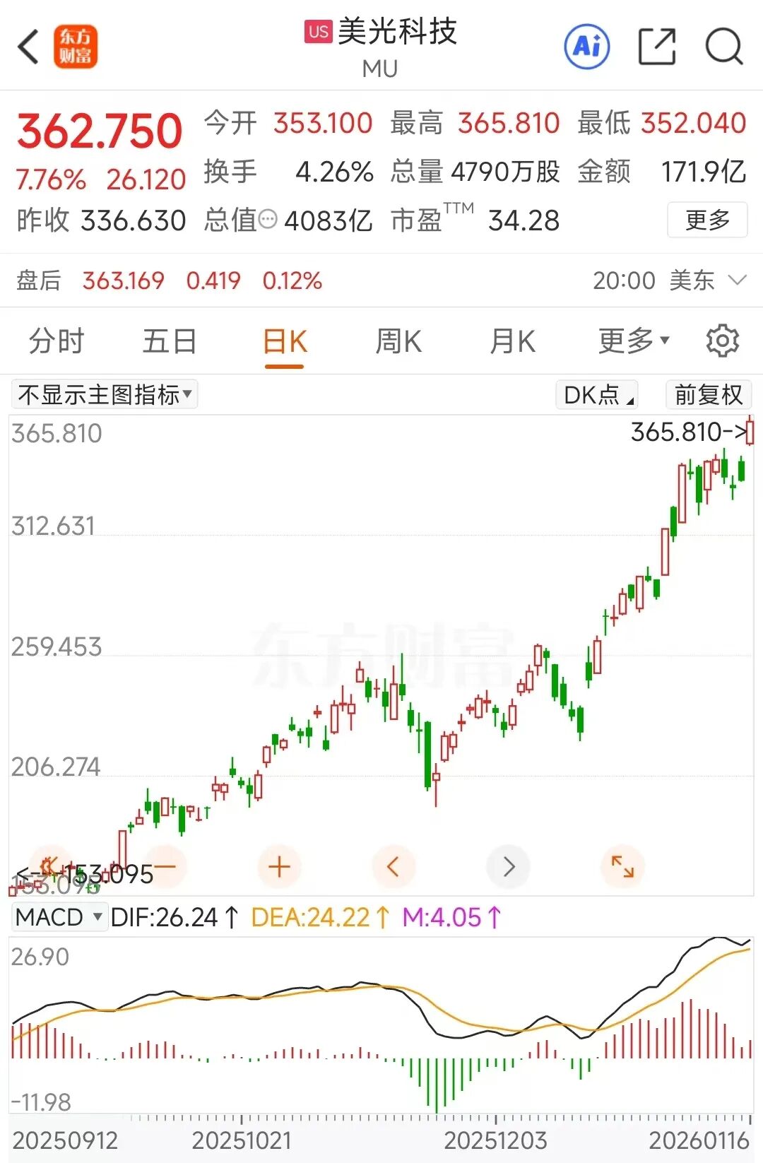具体到盘面的话,美股的半导体板块持续强势。费城半导体指数周五涨1.15%,2026年以来上涨约12%。个股而言,周五美光科技涨近8%,博通涨逾2%,拉姆研究涨超2%,应用材料涨逾2%。其中美光科技股价再创历史新高,最新市值突破4000亿美元,达4083亿美元。