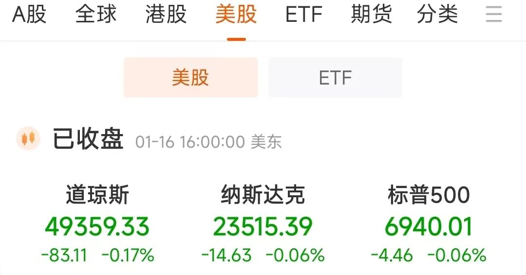 美国三大股指1月16日集体下跌,截至收盘,道琼斯工业指数跌0.17%,报49359.33点;标普500指数跌0.06%,报6940.01点;纳斯达克指数跌0.06%,报23515.39点。本周,道琼斯工业指数跌0.29%,标普500指数跌0.38%,纳斯达克指数跌0.66%。