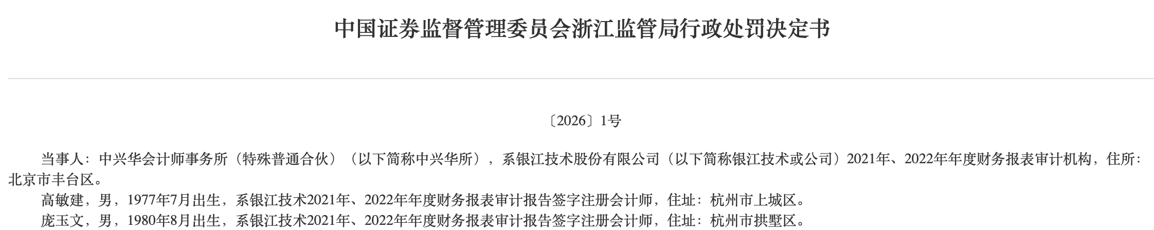 浙江证监局日前更新披露2026年“1号罚单”。根据行政处罚决定书,浙江证监局对中兴华会计师事务所(特殊普通合伙)对银江技术审计执业未勤勉尽责行为进行了立案调查、审理,发现中兴华所出具的银江技术2021年度、2022年度审计报告存在虚假记载,中兴华所在银江技术2021年、2022年年度财务报表审计过程中未勤勉尽责。浙江证监局决定,对中兴华所责令改正,没收业务收入556.6万元,并处以556.6万元罚款,并对其他当事人作出相应处罚。